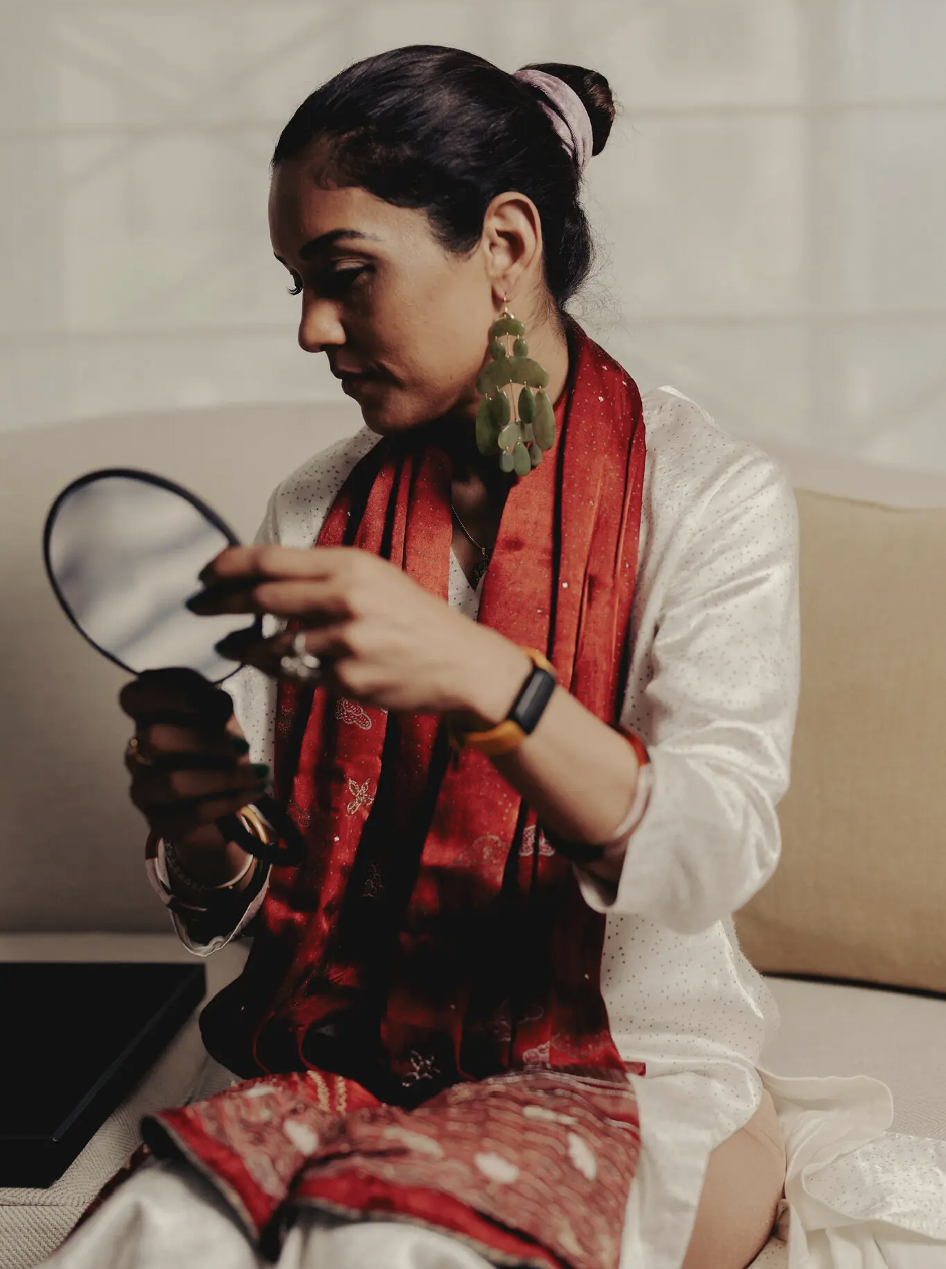 Ms. Parmar’s own emerald, pearl and diamond earrings were designed by HanutSingh, a contemporary designer in New Delhi.
